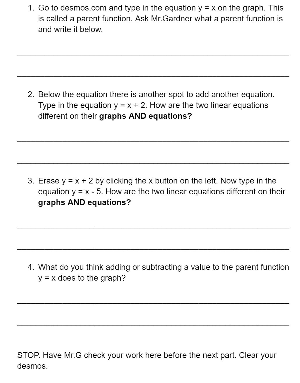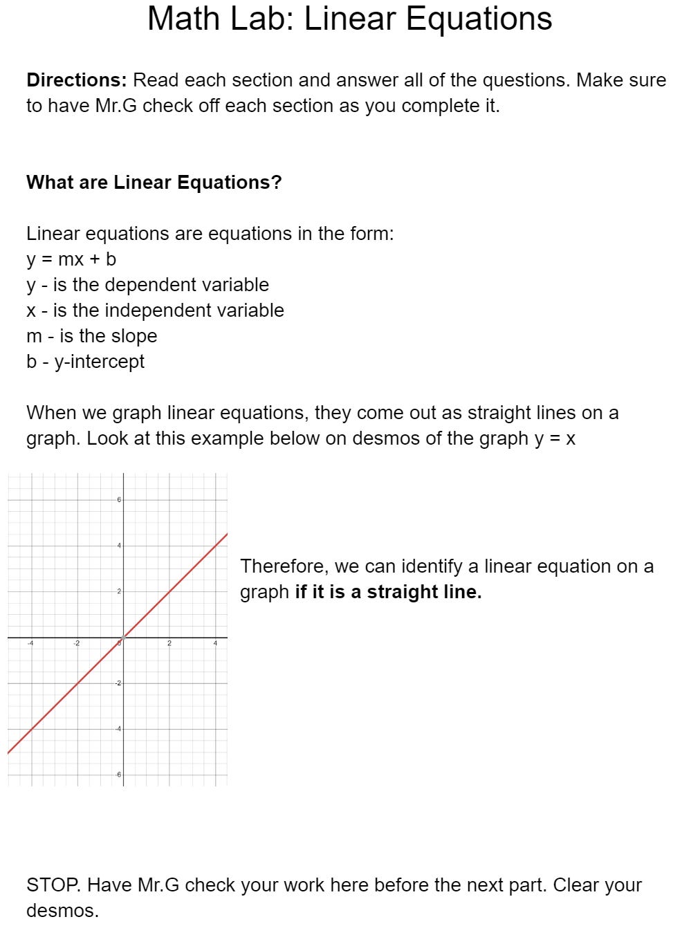 Previously in class, they learned how to graph linear equations and slope intercept form. Therefore, when they get to this activity, they are reviewing the content on the first page and then jumping straight into it. Students are not learning new skills or completing a worksheet in Math Labs.