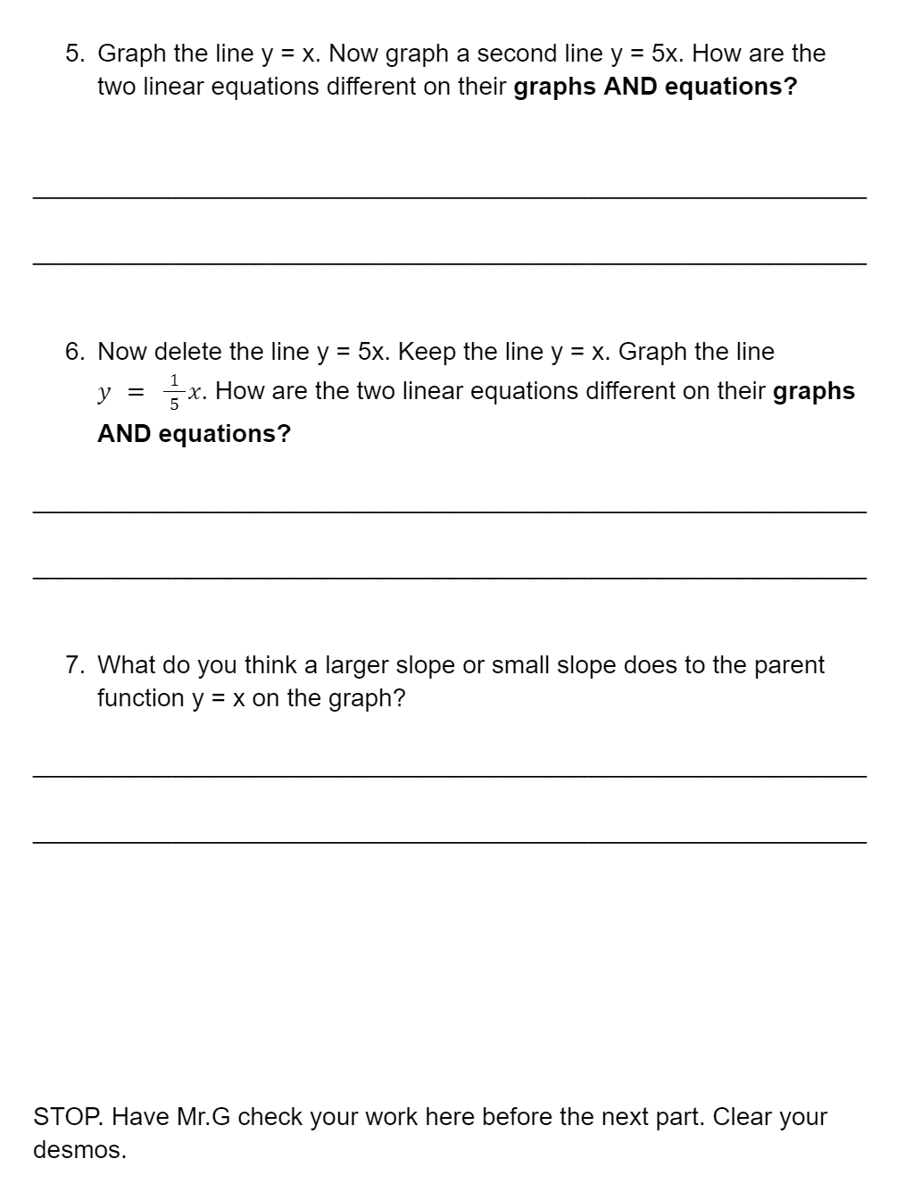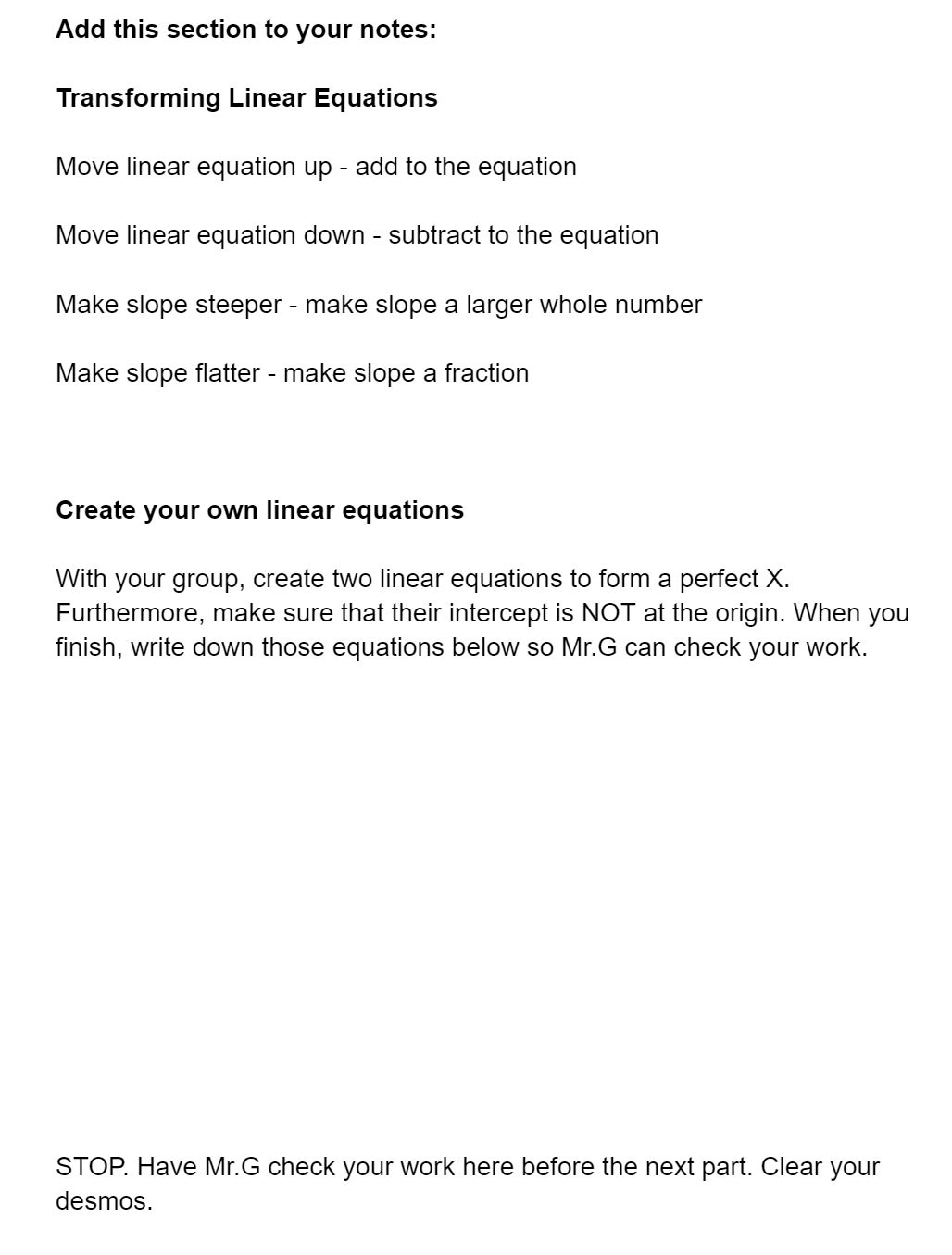 This one is obvious, but Math Labs are not a time to learn a new skill. Math Lab is a time to apply conceptual knowledge towards a learning outcome. For example, before the Math Lab of linear equations (as shown above) I had spent time with students learning about slope, intercept, graphing linear equations, and tables. Therefore, when they got to the lab they could focus on graphing the equations on Desmos and being able to compare and contrast the equations and graphs. Of course they learned about transformations in the lab, but that is a conceptual component and not a skill (for now at least).